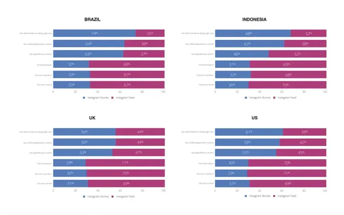 survey conducted by Facebook IQ, users ages 13-55 from Brazil, Indonesia, the UK, and the US offered their insights on Instagram Stories vs. Instagram feed. According to the survey results, as of 2017 more than half of Instagram users globally view both stories and their feed daily.